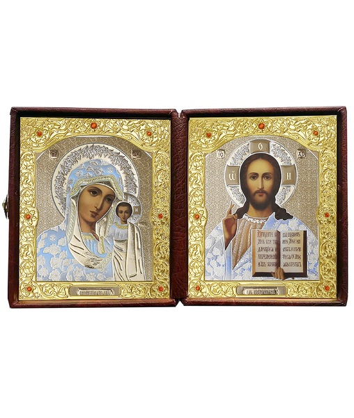 • Кожаный складень не вынимающийся лик 10х12 Софрино белая одежда К-22-1 с золотым окладом, замочком и вышитым крестиком по средине, 32х13х6 см