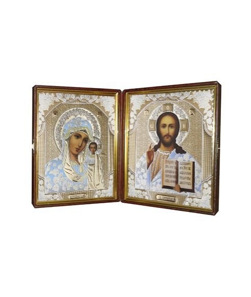 Кожаный складень не вынимающийся лик 10х12 Софрино белая одежда М-22-2 с молдингом, замочком и вышитым крестиком по средине, 32х13х6 см