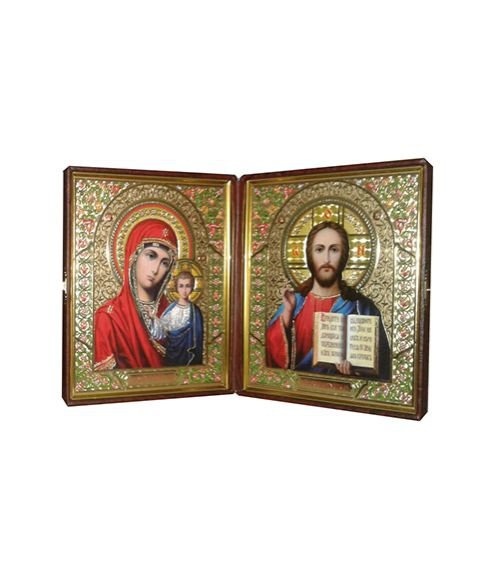 Кожаный складень не вынимающийся лик 10х12 Софрино эмаль М-22-1 с молдингом, замочком и вышитым крестиком по средине, 32х13х6 см