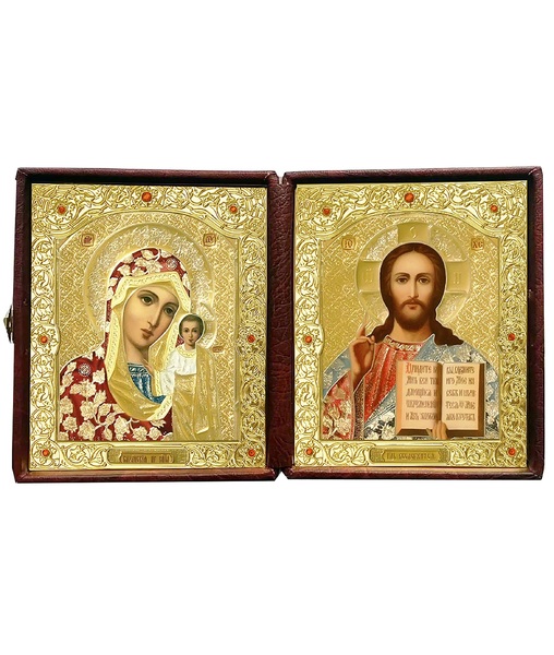 Кожаный складень не вынимающийся лик 10х12 Софрино цветная одежда К-22-2 с золотым окладом, замочком и вышитым крестиком по средине, 32х13х6 см