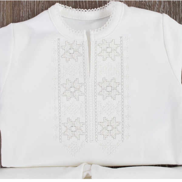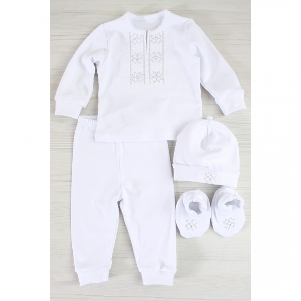 Костюм для хрещення хлопчика Срібна Зірка вишитий білою та срібною ниткою. Включає в себе в себе все необхідне: кофту,штани, шапочку, пінетки У 26 (80) розмірі пінетки відсутні. Виготовлений з тканини інтерлок, бавовна 100%.Нет описания