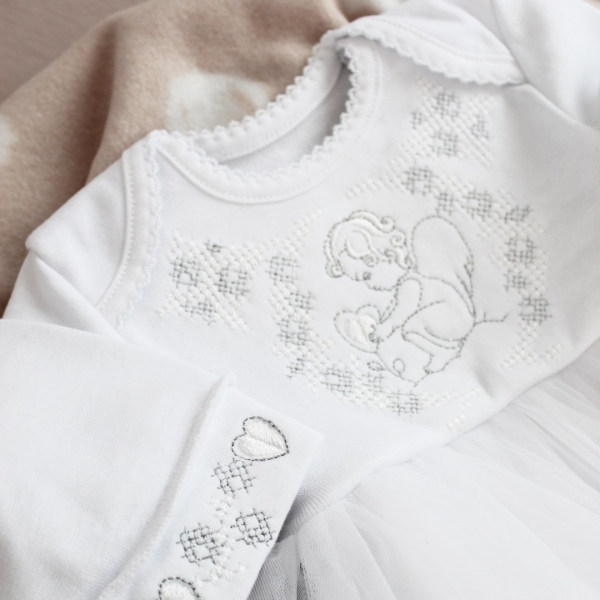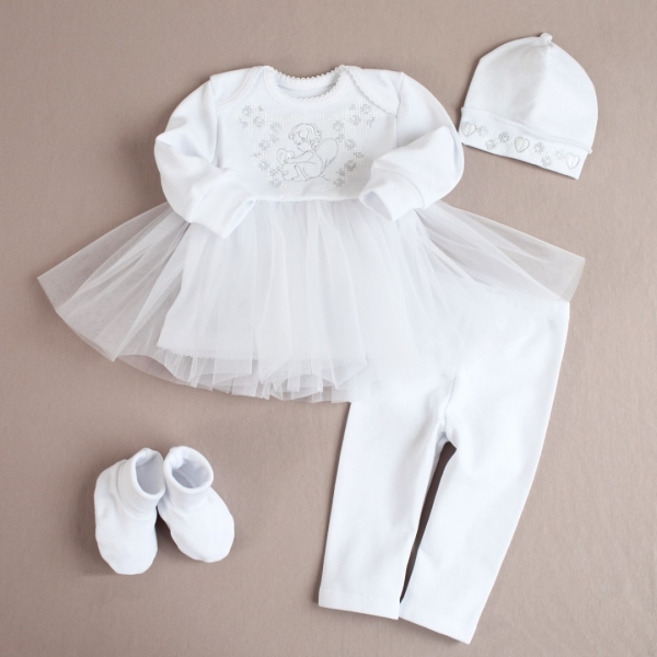 Костюм Angel для хрещення дівчинки з пишним платтячком з євро сітки. Включає в себе все необхідне: плаття, лосіни , шапочку та пінетки. У 80 розмірі пінетки відсутні. Виготовлений з тканини рібана з начосом. Верхній слой спіднички — мягкий фатин (ПЕ 100%). Внутрішня сторона вишивки закрита спеціальною тканиною. Прикрашений даний костюм оригінальною вишивкою з срібною ниткою.Нет описания