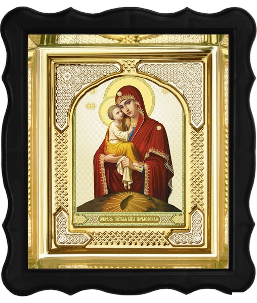 Почаевская икона Божией Матери 3-ФП-51 17х19 см фигурный пластиковый киот, лик 10х12 Тропарь, оклад (риза) золото.