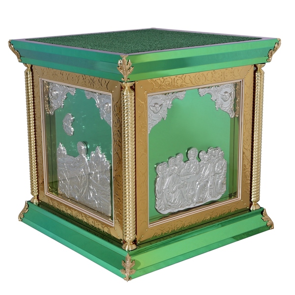 Размер: 100*100*105 см. Чеканка, литые иконы. Основа престола - влагостойкая фанера. Металл - булат (нержавеющая сталь с напылением нитрид титана). Крышка - бархат (мебельная ткань)Нет описания