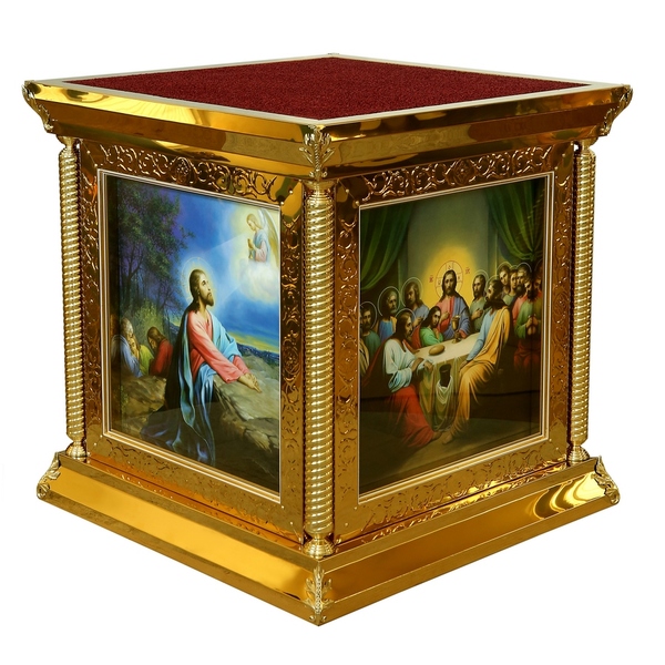 Размер: 100*100 *105см. Чеканка, иконы литография. Основа престола - влагостойкая фанера. Металл - булат (нержавеющая сталь с напылением нитрид титана). Крышка - бархат (мебельная ткань)Нет описания