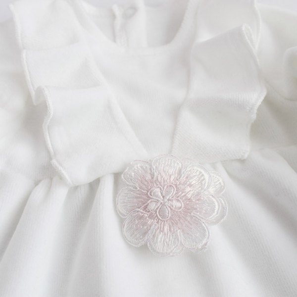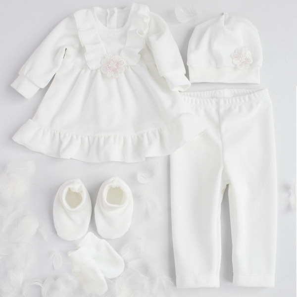Теплий набір для хрещення дівчинки з велюрової тканини Жасмин. Дуже вишуканий та ніжний. Приємного молочного кольору. В комплект входить: плаття з воланчиками, штанята, шапочка, пінетки, та рукавички. Сукня розстібається на спинці по усій довжині, на рукавах манжети, по низу зібрана рюша. Даний комплект прикрашений перламутровими квіточками з блідим персиковим відтінком. Тканина польська велюр, бавовна 100%. Підійде для зимової та демісезонної пори року.Нет описания