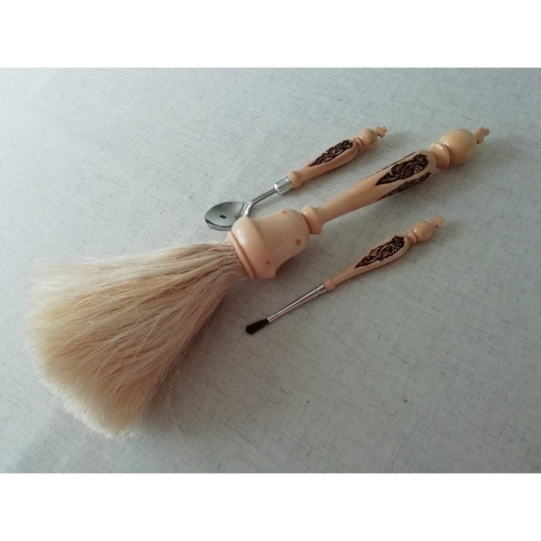 Кропило большое деревянное с крестом / резьба виноград / ворс натуральный (диаметр ворса 30 мм / длина 380 мм) Кисть для помазания (стрючца) / резьба виноград (длина 175 мм) Лжица / дерево / резьба виноград (длина 185 мм)