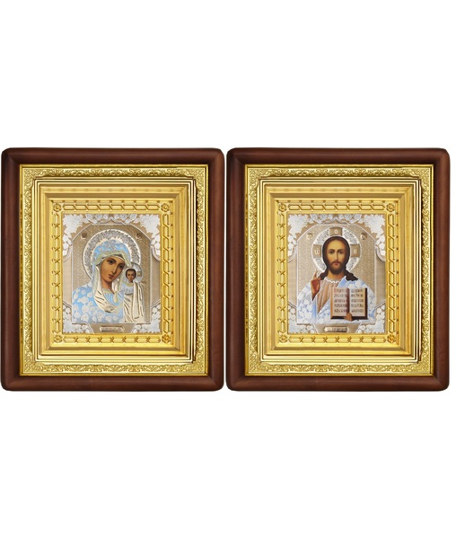 Венчальная пара Икона Спасителя и Казанской Божьей Матери 19-ВП-1 21х24 см деревянный прямой глубокий киот, лик 10х12 Софрино белая одежда, оклад (риза) золото