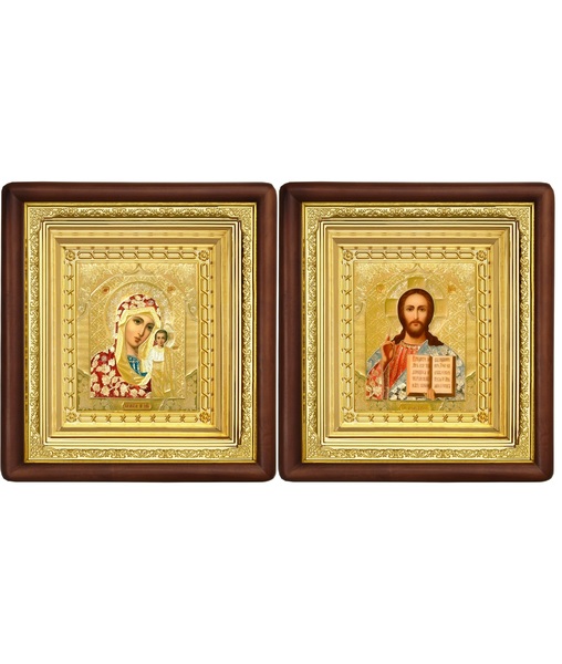 Венчальная пара Икона Спасителя и Казанской Божьей Матери 19-ВП-3 21х24 см деревянный прямой глубокий киот, лик 10х12 Софрино цветная одежда, оклад (риза) золото