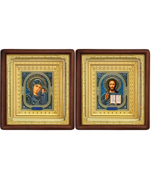 Венчальная пара Икона Спасителя и Казанской Божьей Матери 19-ВП-4 21х24 см деревянный прямой глубокий киот, лик 10х12 Софрино узор, оклад (риза) золото