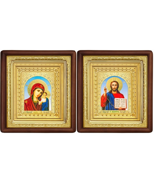 Венчальная пара Икона Спасителя и Казанской Божьей Матери 19-ВП-6 21х24 см деревянный прямой глубокий киот, лик 10х12 Софрино арочный, оклад (риза) золото