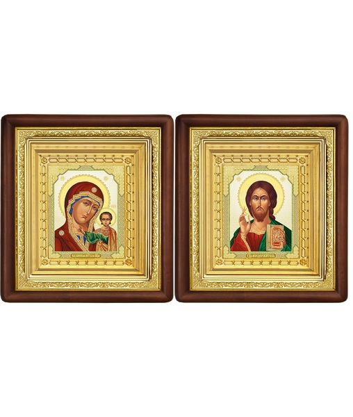Венчальная пара Икона Спасителя и Казанской Божьей Матери 19-ВП-7 21х24 см деревянный прямой глубокий киот, лик 10х12 Софрино византия, оклад (риза) золото