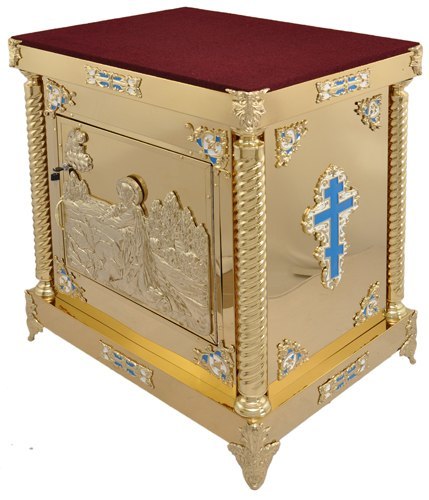 Размер: 75*85*105 см. Булат, на литых ножках, разборный.Основа жертвенника - влагостойкая фанера. Металл - булат (нержавеющая сталь с напылением нитрид титана). Крышка - бархат (мебельная ткань)Нет описания